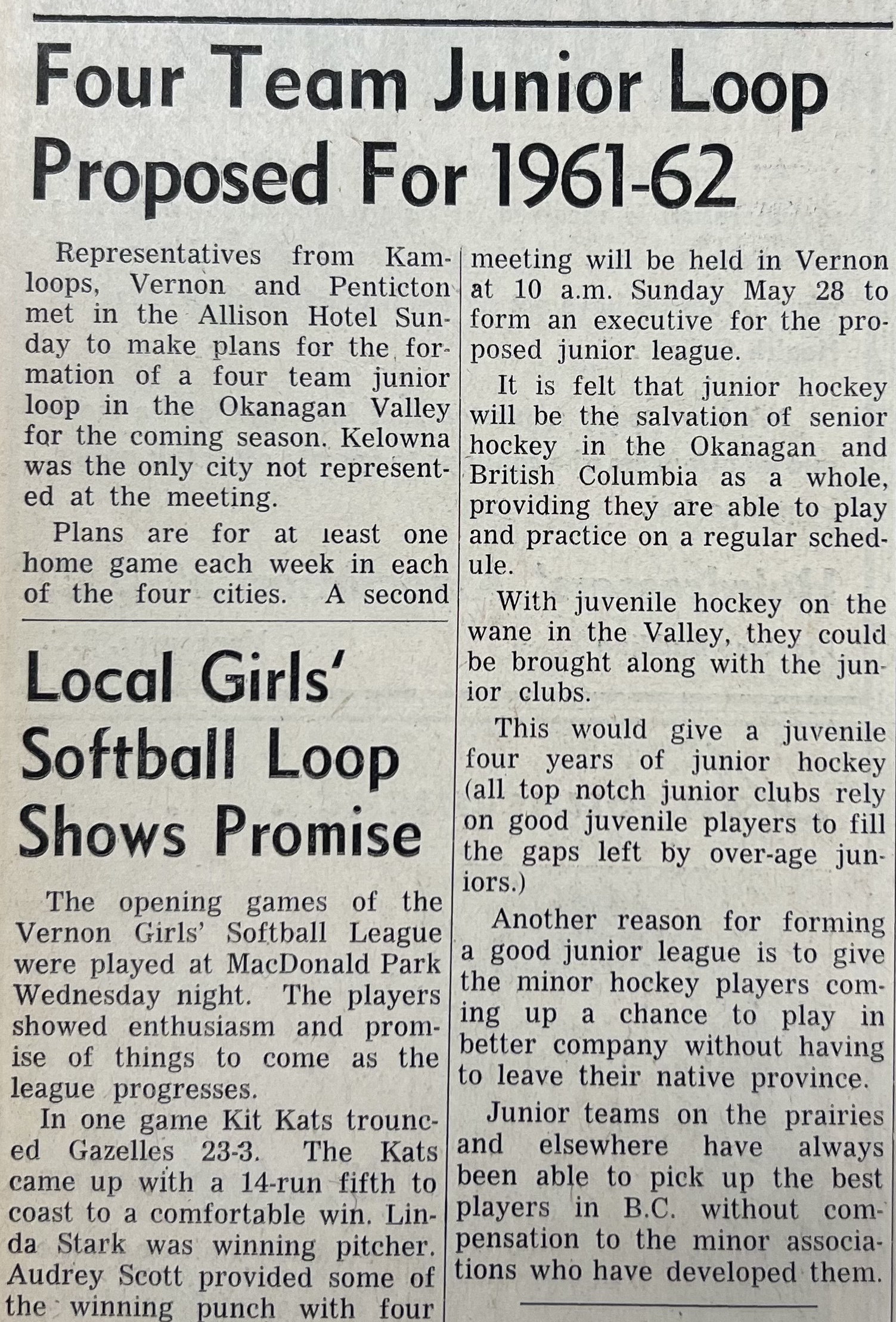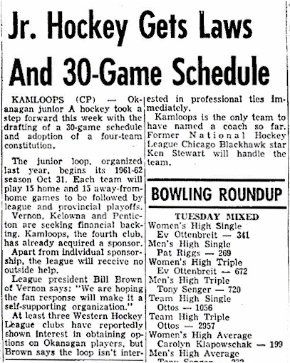 On September 18, 1961 the Kamloops Daily Sentinel reported..."The junior loop, organized last year by several prominent Valley sportsmen and headed by Vernon's Bill Brown will kick off the 1961-62 season Oct 31."