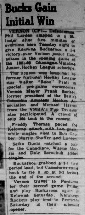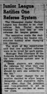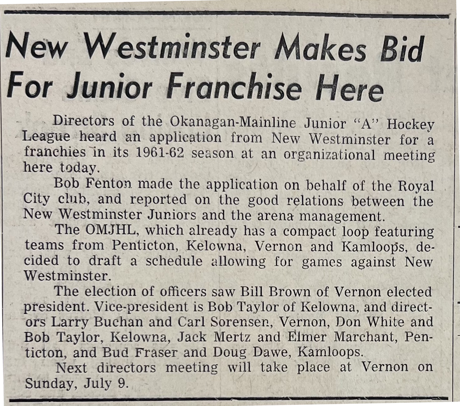 On May 28, 1961 the executive for the Okanagan-Mainline Junior "A" Hockey League was elected and the Vernon News reported..." The election of officers saw Bill Brown of Vernon elected president. Vice-president is Bob Taylor of Kelowna, and directors Larry Buchan and Carl Sorensen, Vernon, Don White and Bob Taylor, Kelowna, Jack Mertz and Elmer Marchant, Penticton, and Bud Fraser and Doug Dawe, Kamloops". An application, to join the league, came from Bob Fenton on behalf of the New Westminster hockey club was heard at this same meeting. (source)