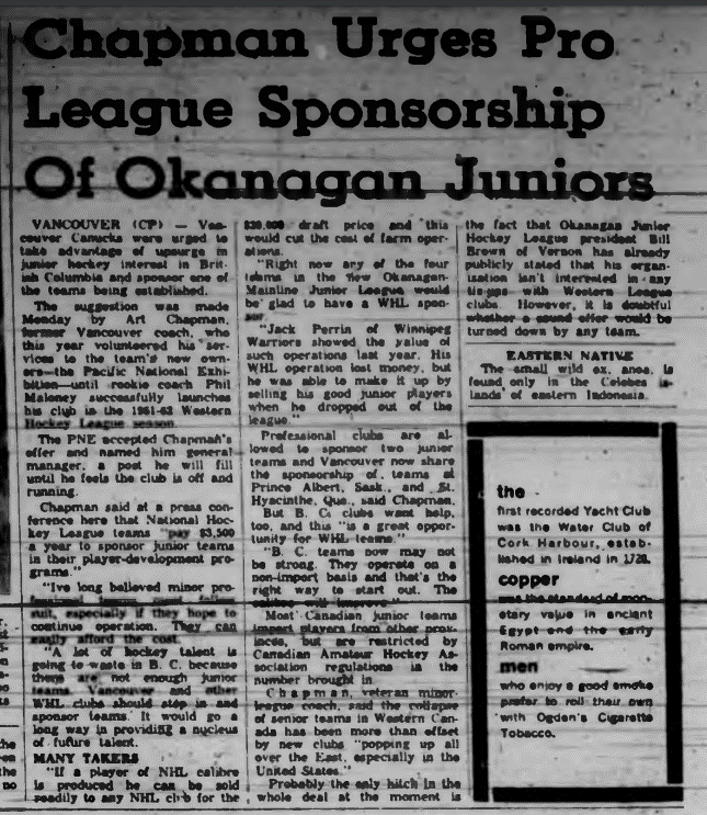 In this era pro hockey teams were allowed to sponsor two junior teams. In an article from the Kamloops Daily Sentinel Art Champman, a Vancouver Canucks(WHL)former coach said, "Right now any of the four teams in the new Okanagan-Mailine Junior League would be glad to have a WHL sponsorship."