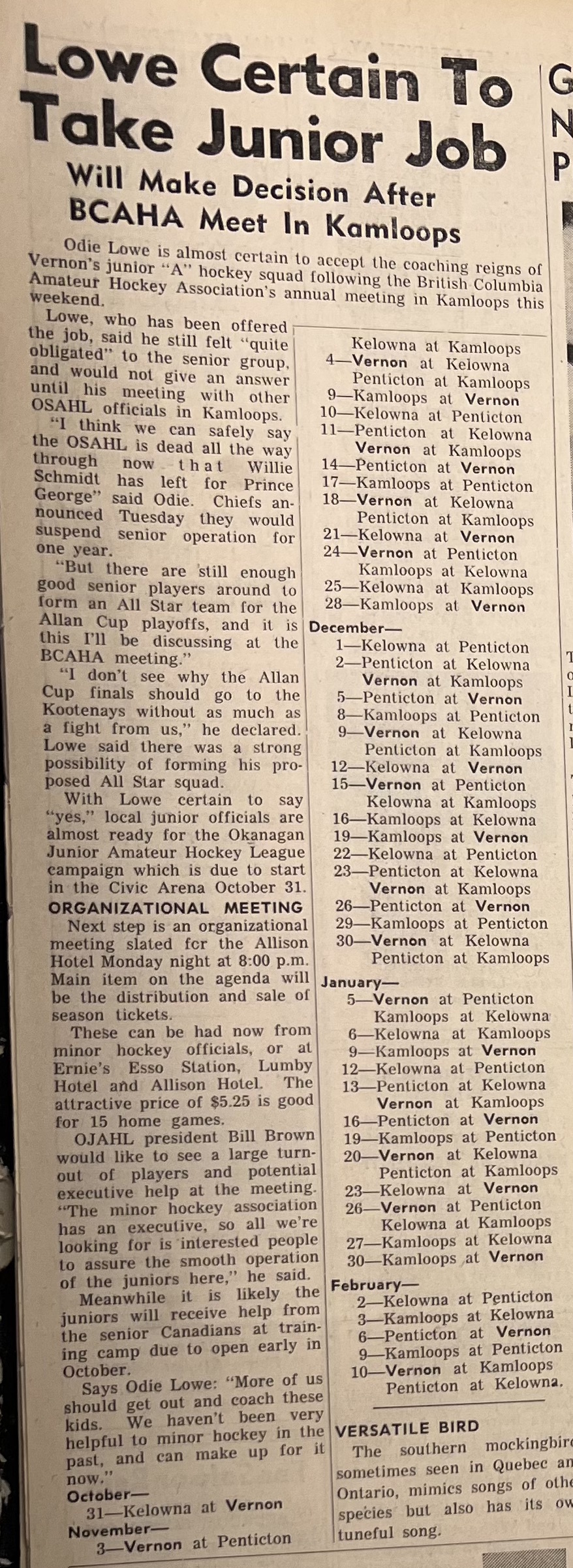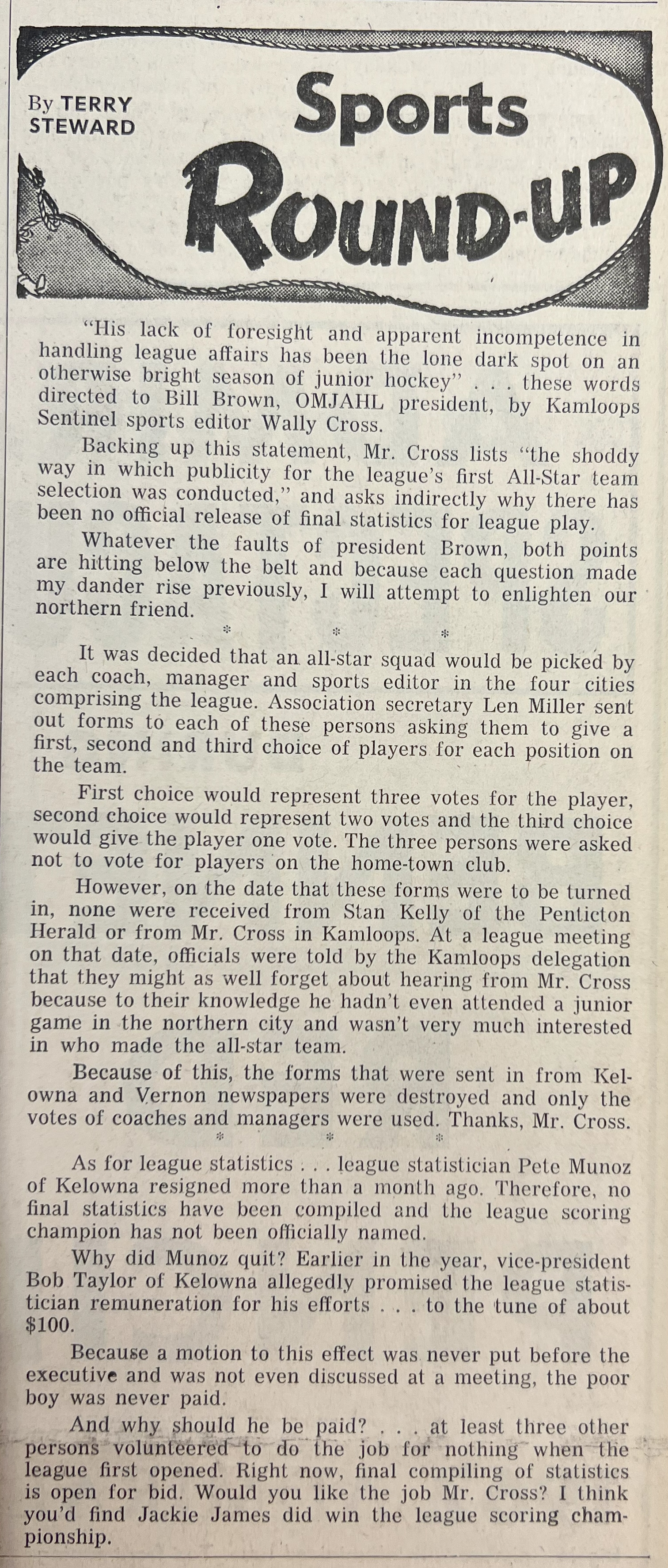 The OMJAHL discussed the idea of WHL sponsorship at length as mentioned in an article from the Vernon News of August 28, 1961, "The subject of hookups with the Western Hockey League was broached and received full discussion. Down Brown, from Kamloops, said: "I can't see us giving up our club to some pro oganization." However, all members present agreed that donations received (without strings) would be most welcome.