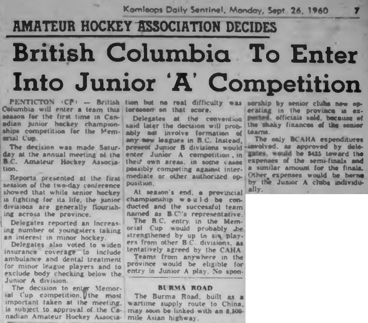 Interest in Junior 'A' surfaced in BC, for real, in September of 1960, at the annual meeting of the BCAHA. It was decided by the BCAHA(British Columbia Amateur Hockey Association), with the approval of the CAHA(Canadian Amateur Hockey Association), that BC would enter a Junior 'B' team, for the first time, in Canadian junior hockey competition for the Memorial Cup. (source)