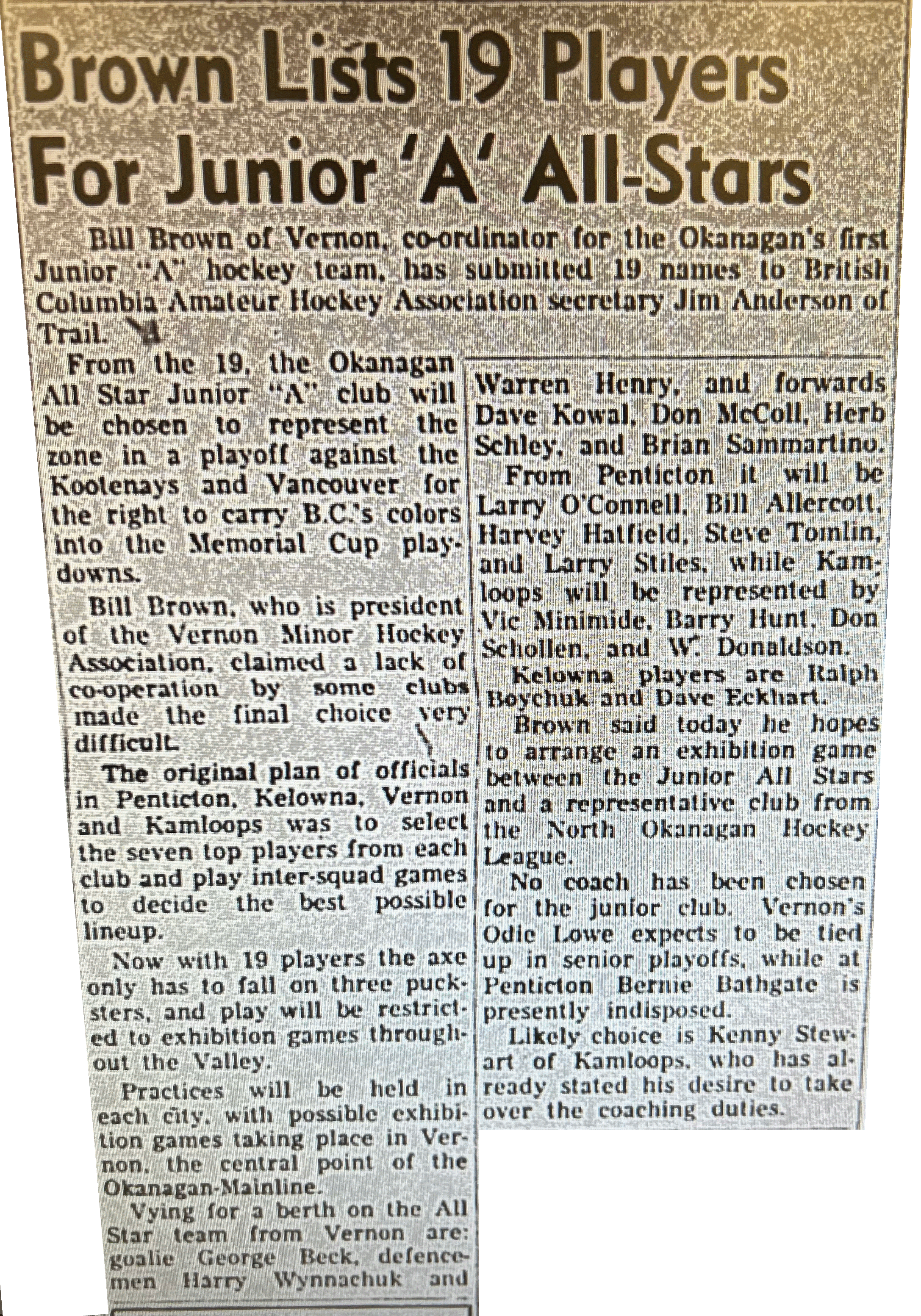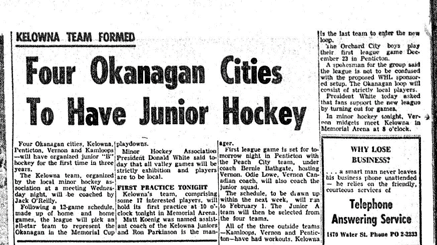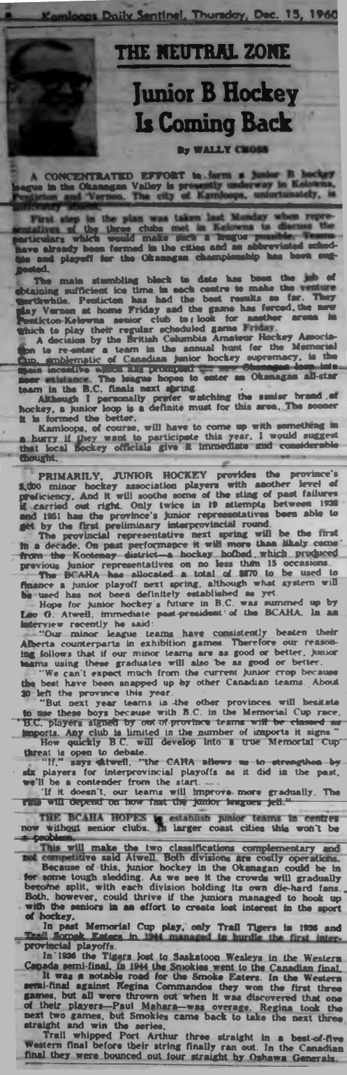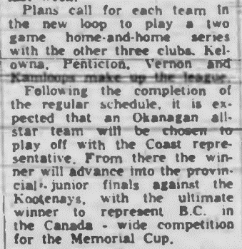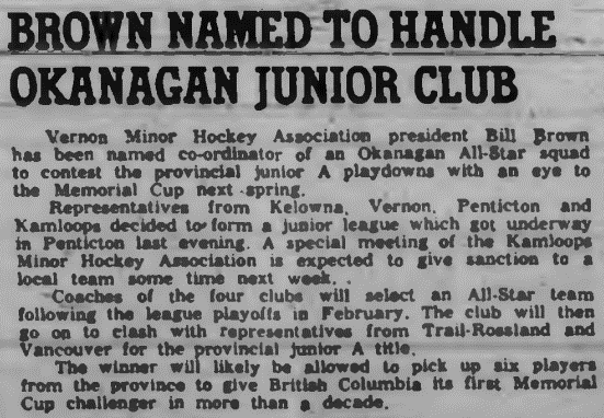 On December 15th, 1960 the Vernon News reported... "Vernon Minor Hockey Association President Bill Brown has been named coordinator of an Okanagan-Mainline All Star squad to contest the Provincial junior 'A' playdowns with an eye to the Dominion Memorial Cup next spring. At the meeting in Kelowna, Monday, representatives from the four major Okanagan-Mainline cities decided to form a junior league which will kick off in Penticton Friday night with Vernon the visitor..." (source) / (source 2)
