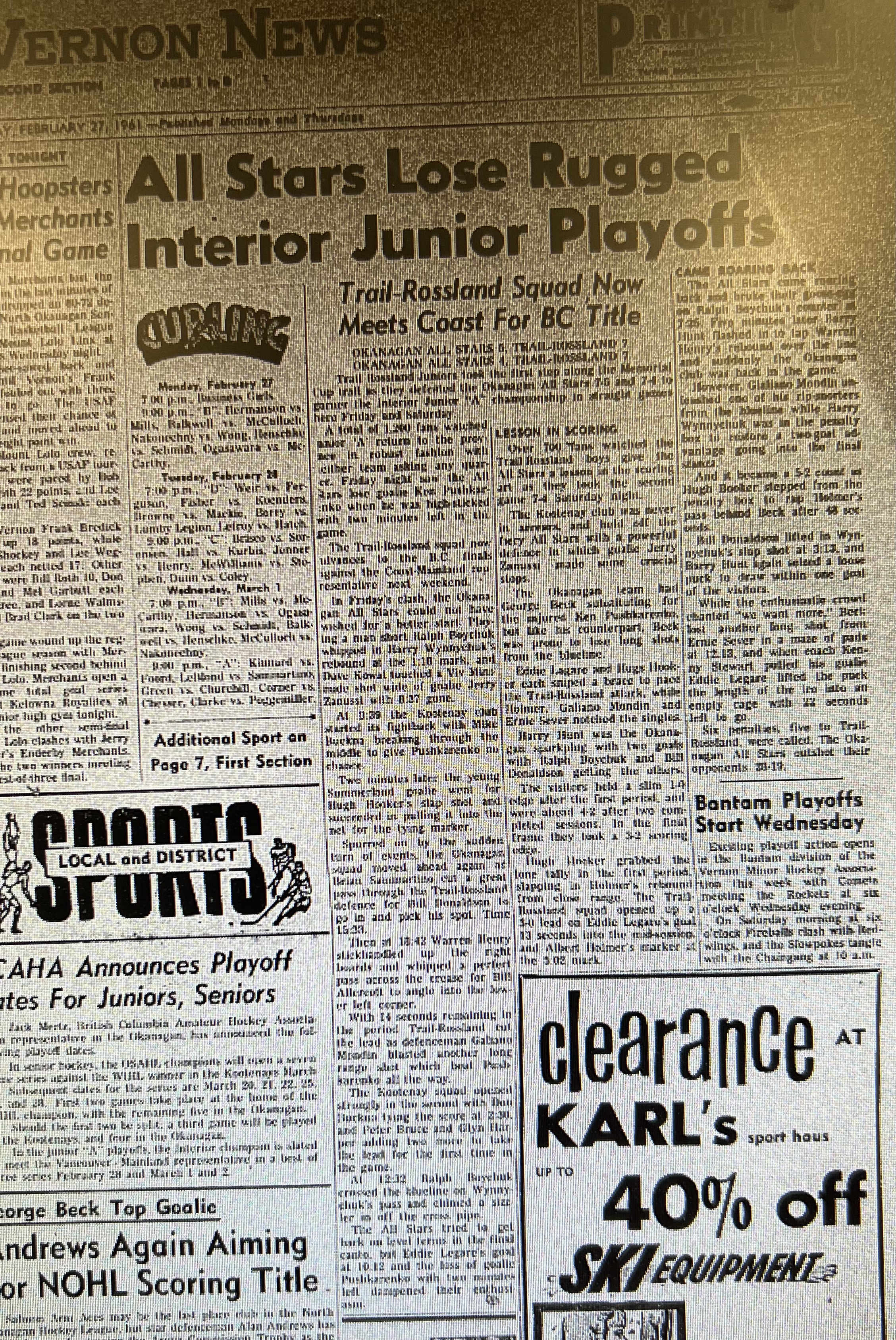 While the All Star team wasn't successful in securing the Dominion Cup, losing to Trail/Rossland 7-0 and 7-4 in semi-final action, they did lay the foundations for the formation of a junior 'A' league. (source)