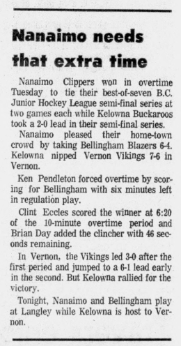 | 5 Sat. | @ Nanaimo Clippers | 3 | 12 | Gm 4 (source) | |||