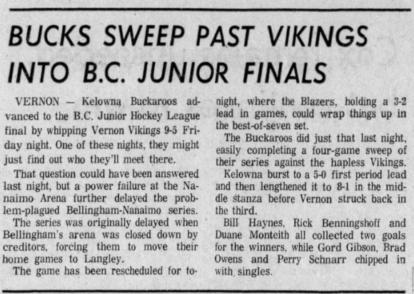 | Sun Mar 16 | @ Kelowna | 1 | 2 | PO 7 (source) | |